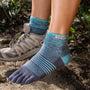Conçue pour les femmes qui courent de longues distances et randonnent rapidement sur des sentiers variés et accidentés, cette chaussette offre confort et protection, tout en assurant liberté de mouvement et maintien. Confortable sans être contraignante, sa hauteur mi-mollet et son double bord-côte protègent de la saleté, du sable et des débris. La matière COOLMAX® EcoMade évacue l'humidité, le nylon garantit la durabilité et la coupe plus étroite et extensible est spécialement adaptée à la morphologie des pieds et des orteils féminins. Le soutien de la voûte plantaire intégré améliore la respirabilité, et notre conception unique enveloppe chaque orteil pour minimiser les ampoules, créer un espace naturel et évacuer l'humidité plus efficacement.
